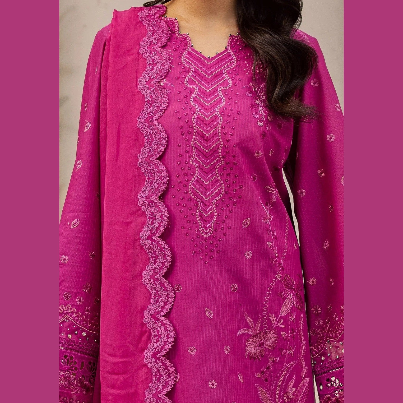 This product is a women’s 3-piece set by Daria, style code DA-31. It includes a top, bottom, and dupatta in pink color. The set is made of cotton lawn fabric and features a round neckline, full sleeves, and a regular fit.