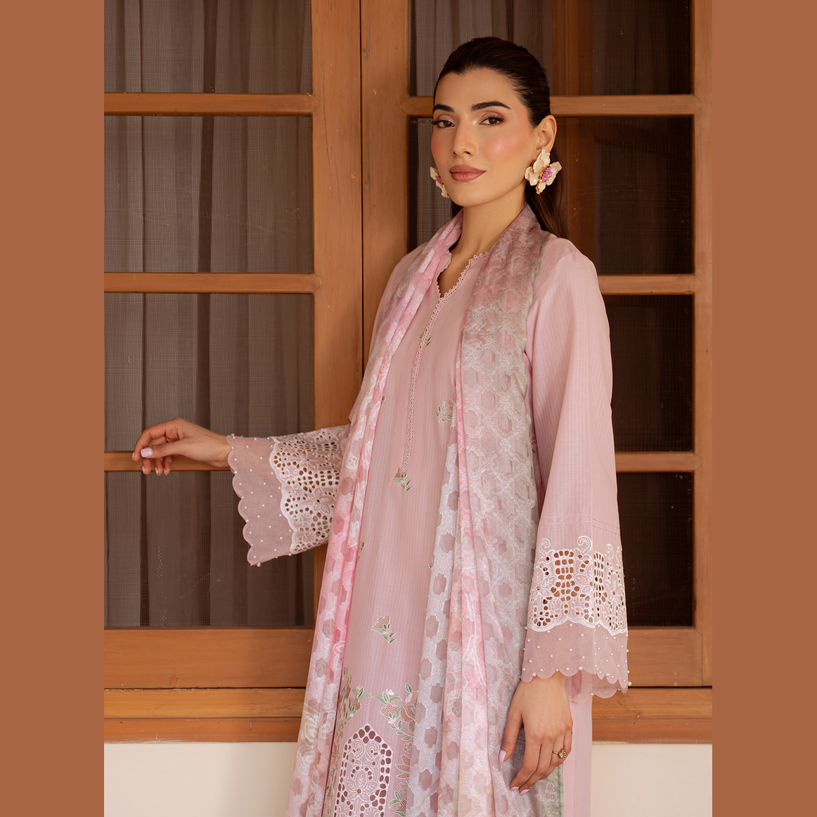 This product is a women’s 3-piece set by Daria, style code DA-42. It includes a top, bottom, and dupatta in pink color. The set is made of cotton lawn fabric and features a round neckline, full sleeves, and a regular fit.